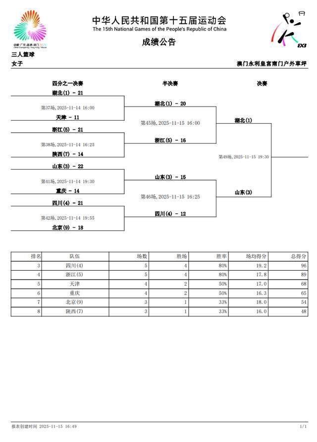 11月15日,十五运三人女篮项目来到了倒数第二比赛日,在半决赛中,湖北三人女篮爆冷,以20-16击败万济圆率领浙江队,打进决赛。另一场比赛中,凭借杨衡瑜拿下8分7篮板,王丽丽4分,山东队15-12击败四川队,晋级决赛。至此,本届全运会三人女篮决赛对手就出炉了,山东将与湖北争夺金牌,比赛时间就在今晚。