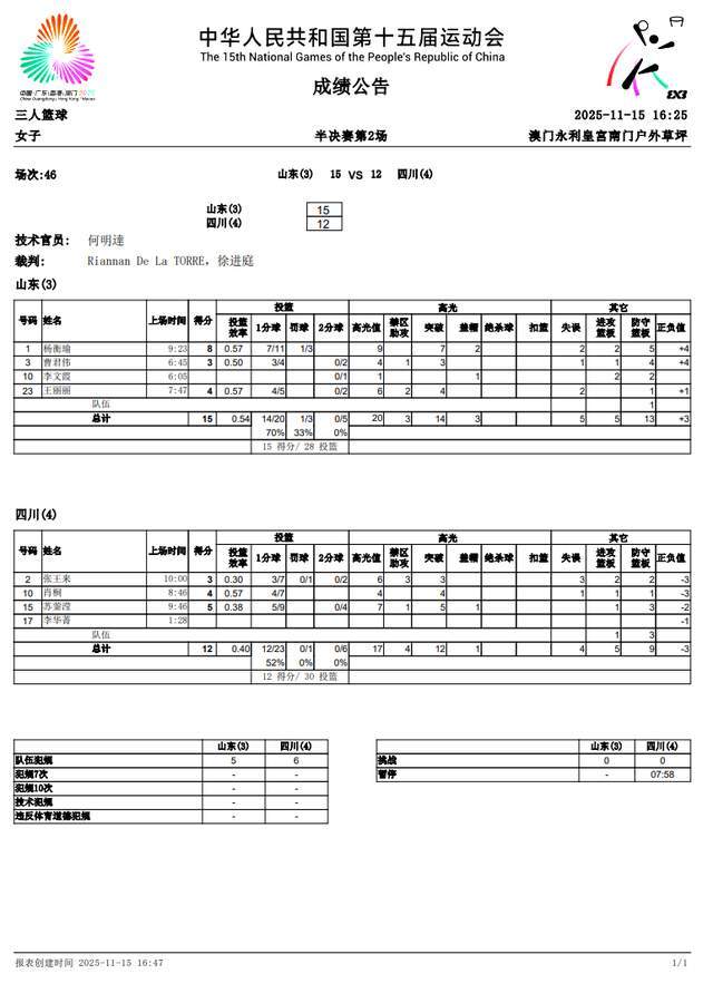 四川队张王来9投3中,1罚不中,拿到3分4篮板,肖桐7投4中,拿到4分2篮板,苏蓥滢13投5中,拿到5分4篮板。两队没有一人打进2分球,山东队5投0中,四川队6投0中。