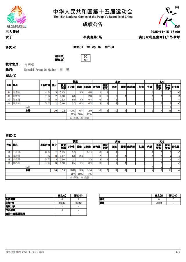 浙江队万济圆8投6中,4罚2中,拿到8分3篮板,余佳锦3分5篮板,孙凤艺3分1篮板,王佳琦17投2中,外线11投0中,拿到2分6篮板。