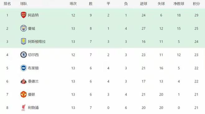 英超最新积分战报 阿森纳平切尔西多曼城5分 利物浦止颓势升至第8